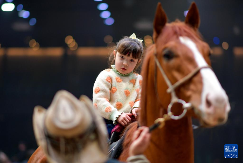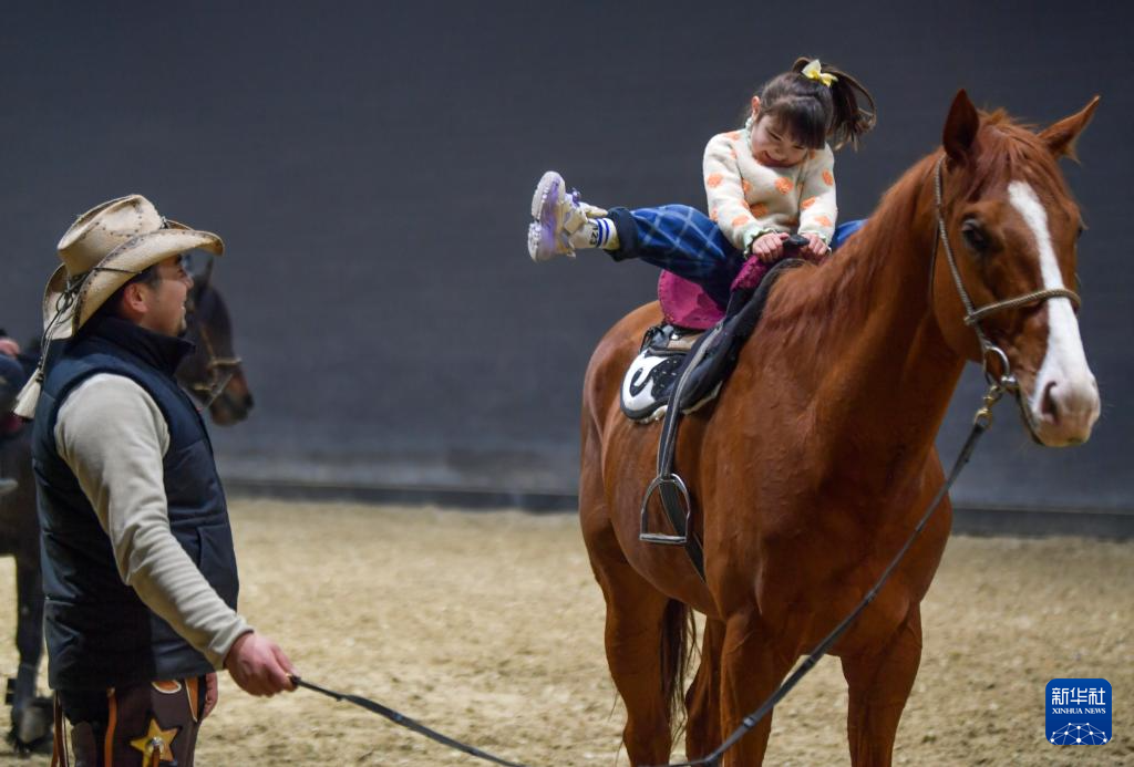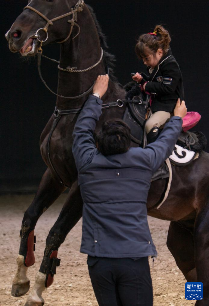 3月7日,在汗血马基地,夏克拉在爸爸希尔扎提的指导下练习骑马。