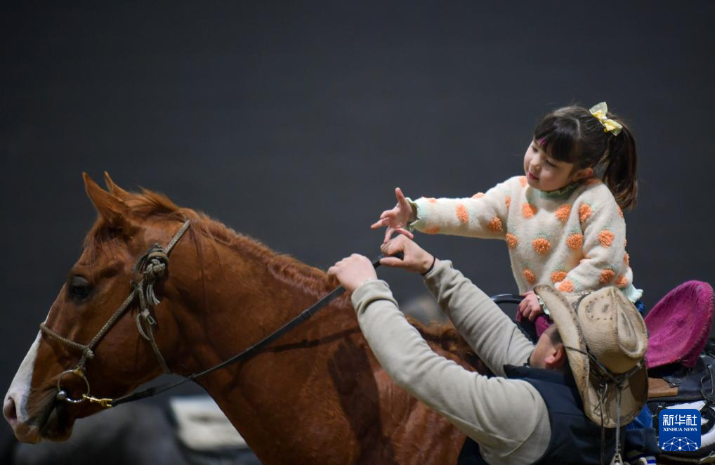 3月6日,在汗血马基地,夏克拉在爸爸希尔扎提的指导下练习骑马。