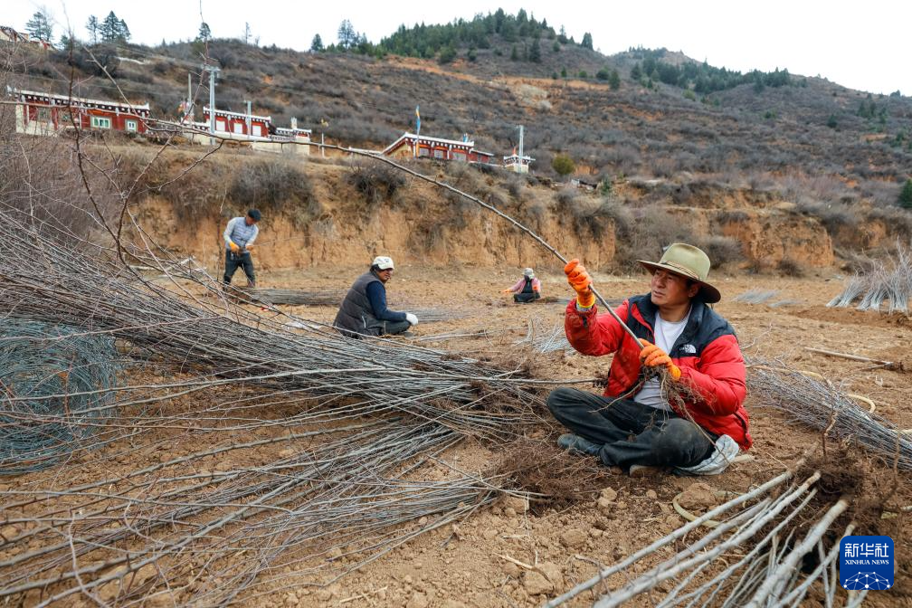 道孚县木茹乡古碉村的村民在挑选培育好的变叶海棠苗木(3月10日摄)。