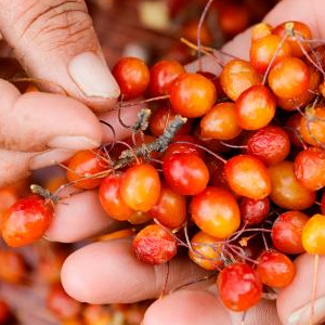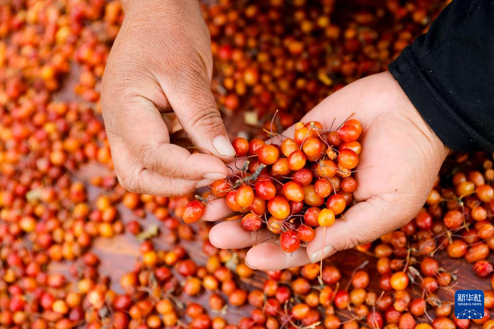 在道孚县农特产品加工园区内的一家食品公司,工人在筛选用于制作饮料的变叶海棠果实(3月10日摄)。