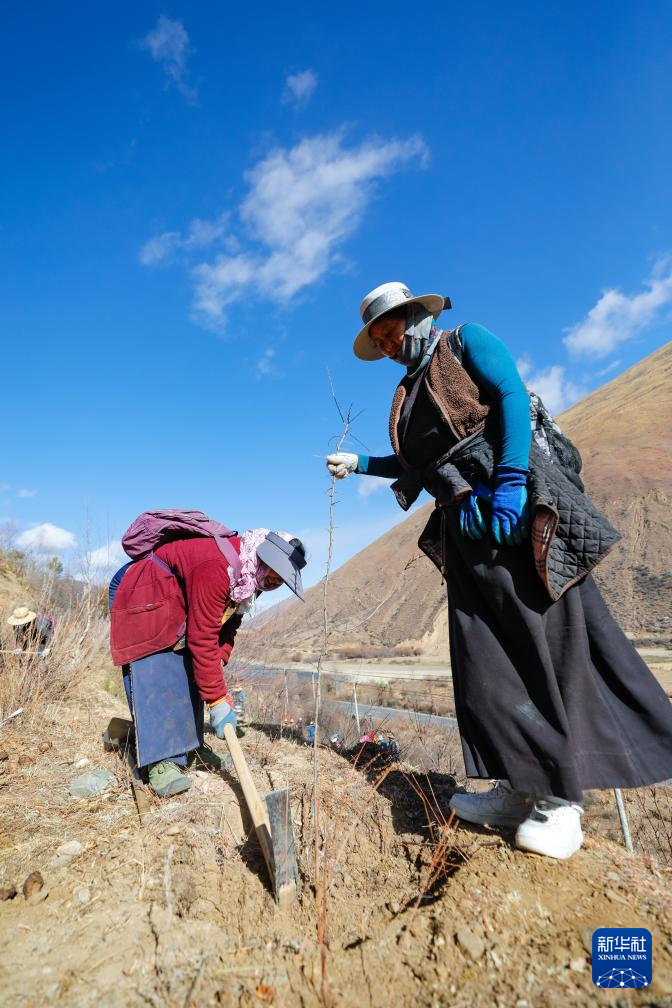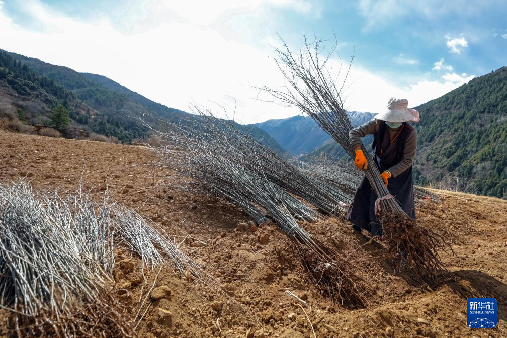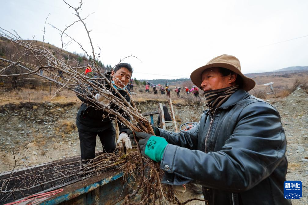 道孚县麻孜乡德尔瓦村的村民在川西高原鲜水河畔的山上种植变叶海棠苗木(3月10日摄)。