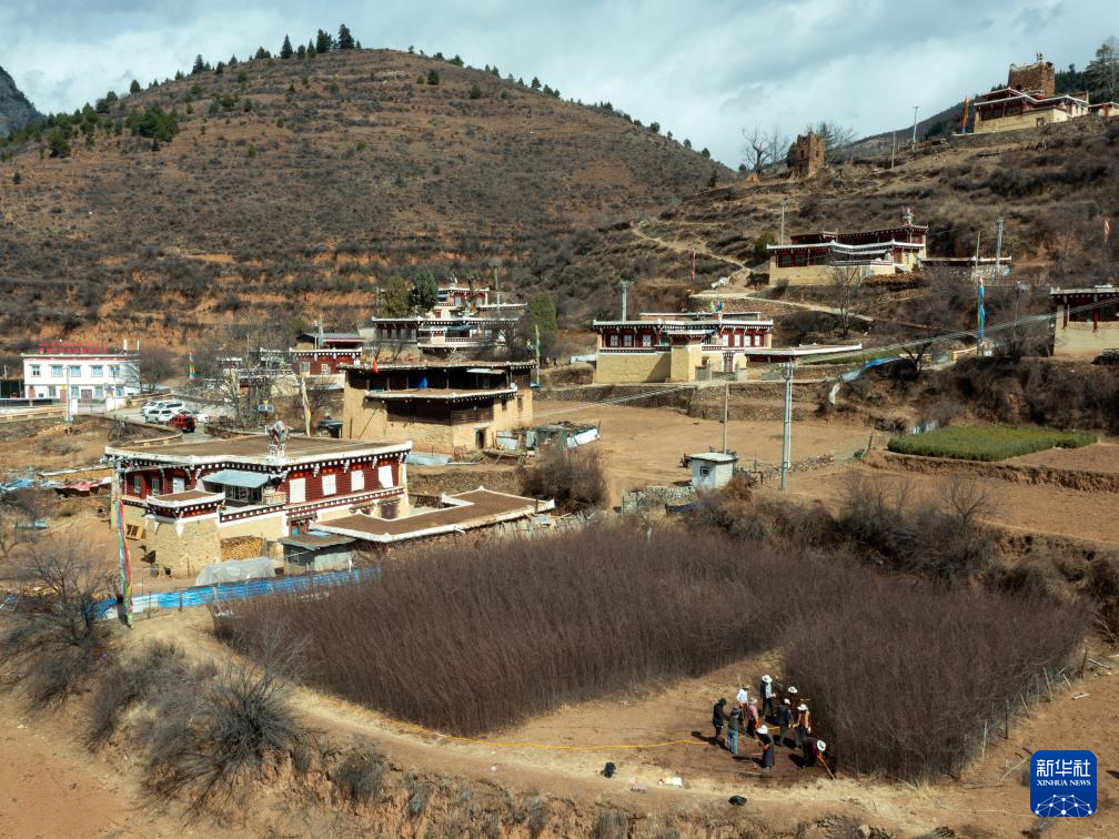 道孚县木茹乡古碉村的村民在挑选培育好的变叶海棠苗木(3月10日摄,无人机照片)。