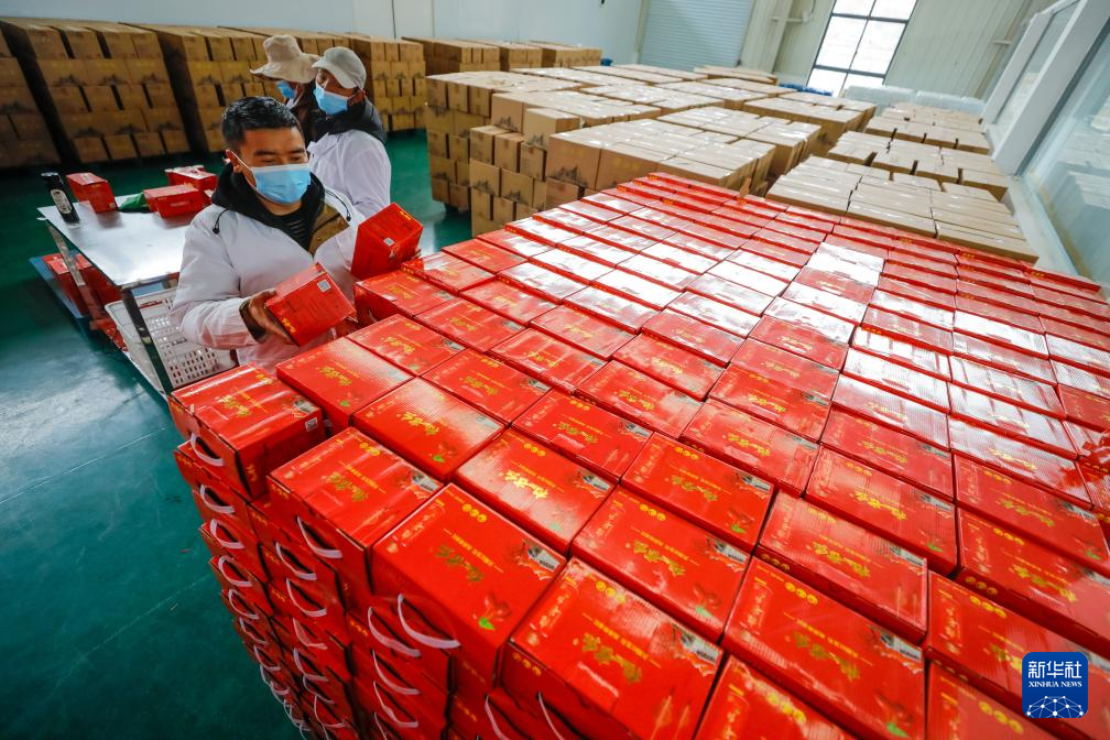 在道孚县农特产品加工园区内的一家食品公司的包装车间,工人在整理摆放名为“根雀红”的饮料产品(3月10日摄)。