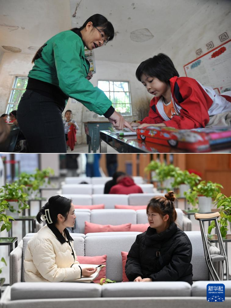 这是一张拼版照片,上图为:在广西灵川县灵川镇的三叉尾小学,董倩趴在床上听英语老师文秋红辅导功课(2012年9月13日摄)。下图为:在广西桂林师范高等专科学校,董倩(右)在和大学辅导员毛文慧老师谈心(2024年3月13日摄)。
