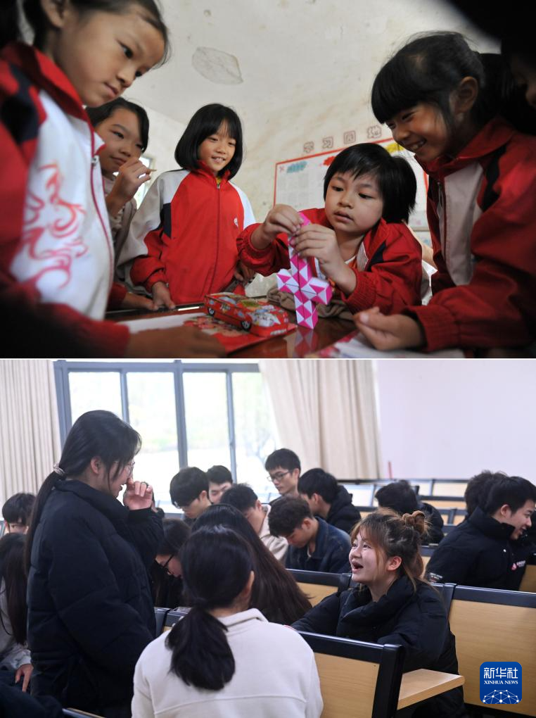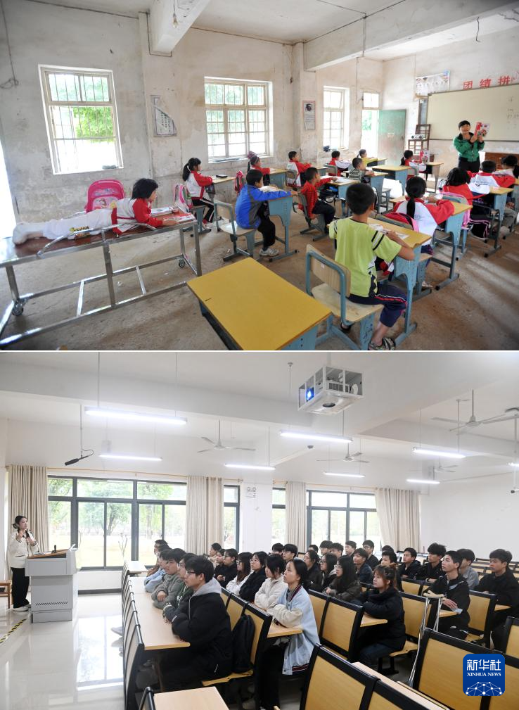 这是一张拼版照片,上图为:在广西灵川县灵川镇的三叉尾小学,董倩(右二)课间和同学在一起(2012年9月13日摄)。下图为:在广西桂林师范高等专科学校,董倩(二排右一)课间和同学聊天(2024年3月13日摄)。