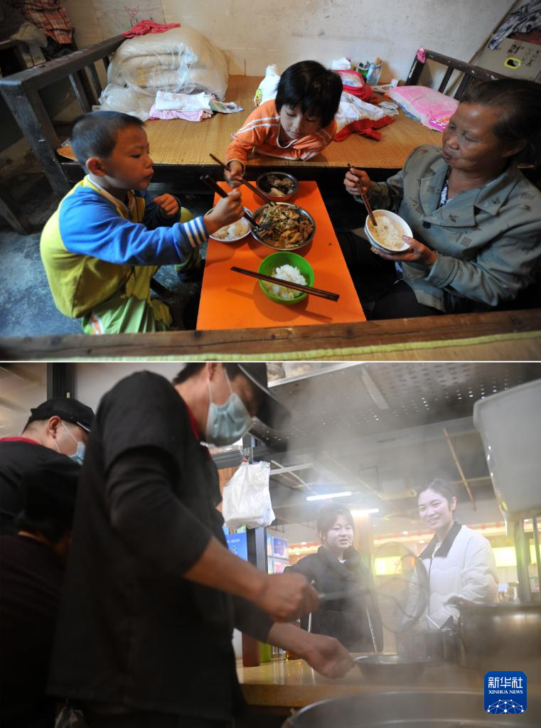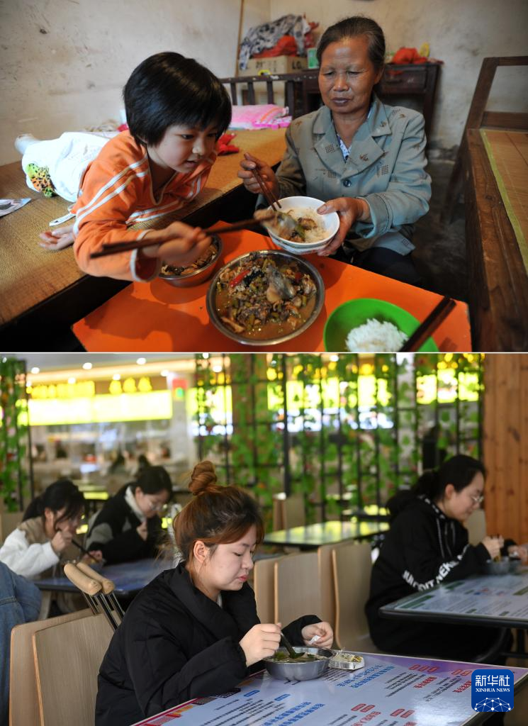 这是一张拼版照片,上图为:在广西灵川县灵川镇的三叉尾小学,董倩在宿舍和奶奶一起吃午饭(2012年9月13日摄)。下图为:在广西桂林师范高等专科学校,董倩(前)在食堂用餐(2024年3月13日摄)。