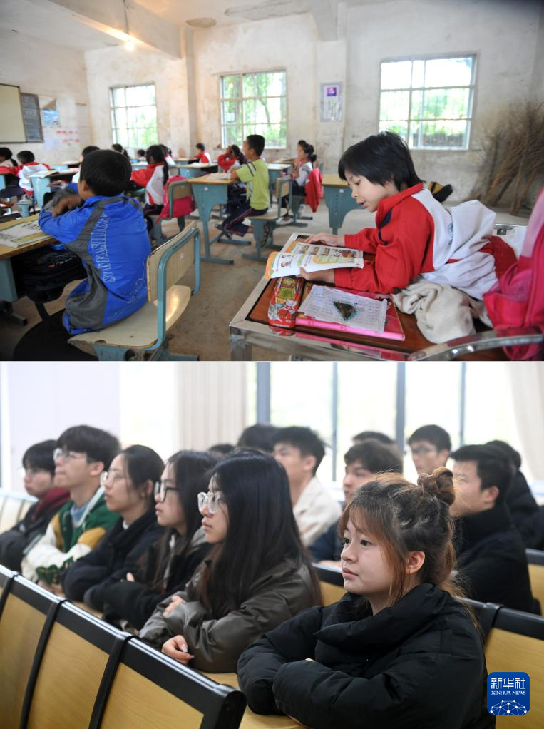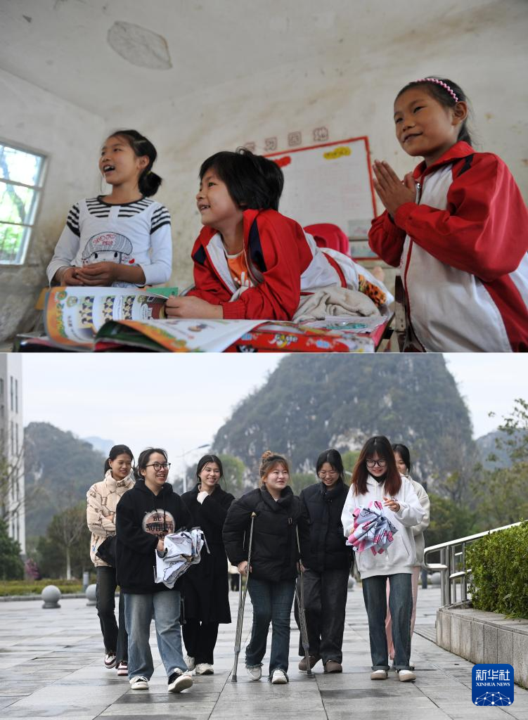 这是一张拼版照片,上图为:在广西灵川县灵川镇的三叉尾小学,董倩(中)课间和同学在一起(2012年9月13日摄)。下图为:在广西桂林师范高等专科学校,董倩(左四)课后和同学走在校园里(2024年3月13日摄)。