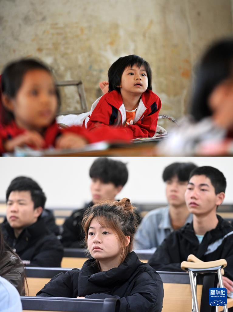 这是一张拼版照片,上图为:在广西灵川县灵川镇的三叉尾小学,董倩趴在床上听课(2012年9月13日摄)。下图为:在广西桂林师范高等专科学校,董倩(前)在课堂上听课(2024年3月13日摄)。
