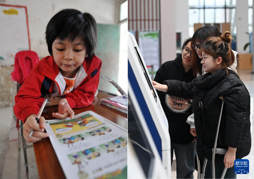 这是一张拼版照片,左图为:在广西灵川县灵川镇的三叉尾小学,董倩趴在床上学习(2012年9月13日摄)。右图为:在广西桂林师范高等专科学校,董倩(右)在图书馆通过电子设备查找书籍(2024年3月13日摄)。