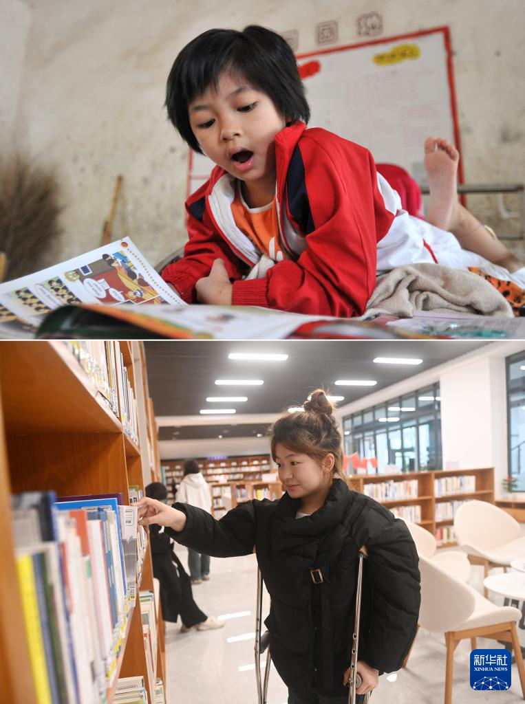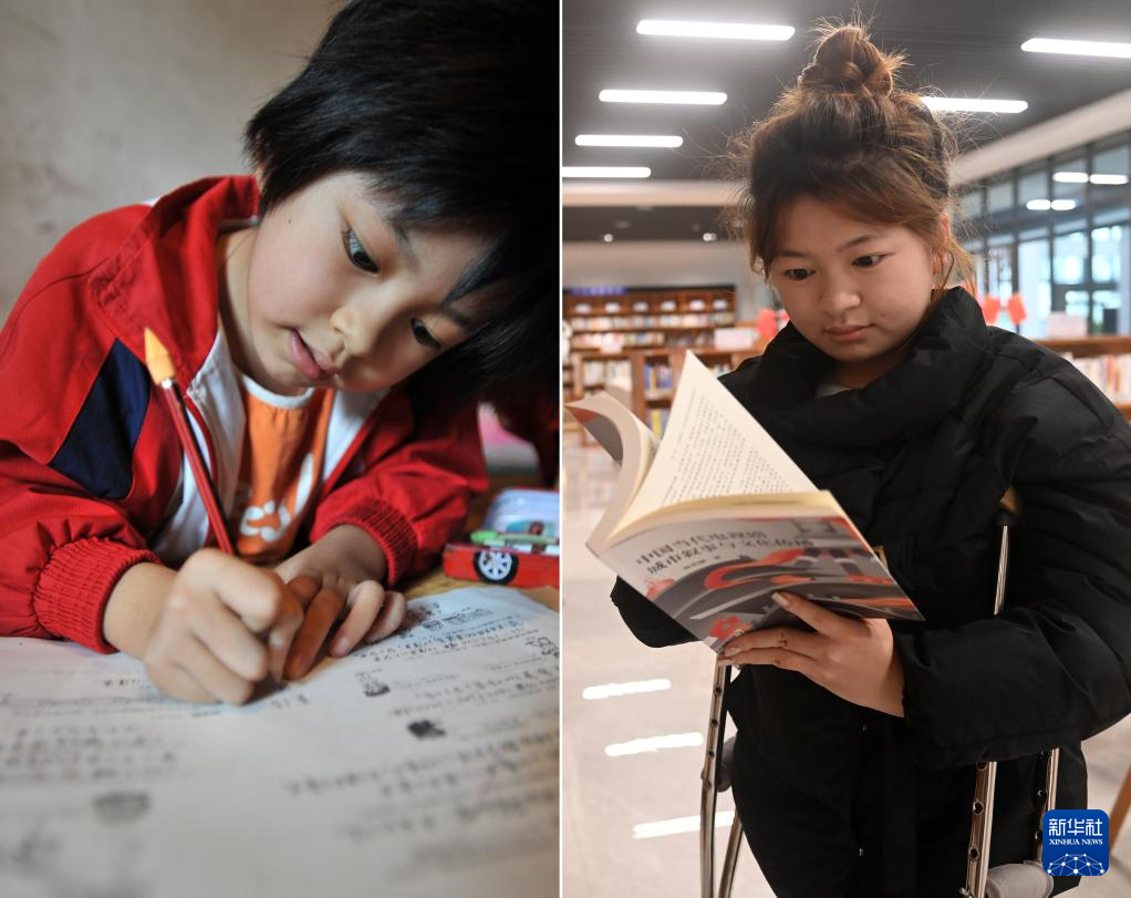 这是一张拼版照片,左图为:在广西灵川县灵川镇的三叉尾小学,董倩趴在床上学习(2012年9月13日摄)。右图为:在广西桂林师范高等专科学校,董倩在图书馆看书(2024年3月13日摄)。