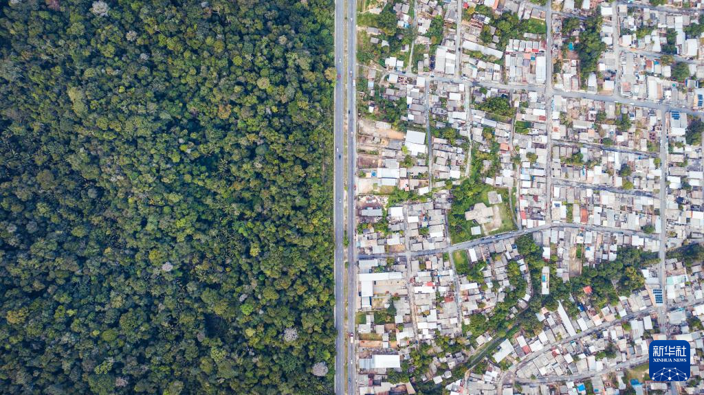 这是3月13日在巴西亚马孙州首府马瑙斯拍摄的居民区与热带雨林的交界处(无人机照片)。