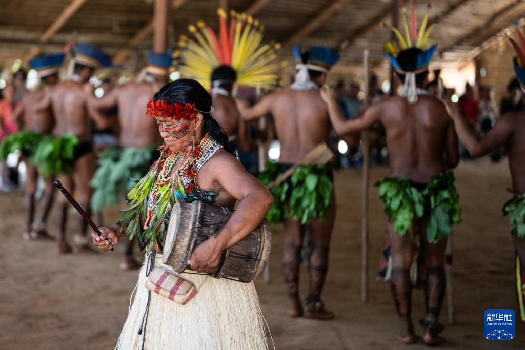 3月14日,在巴西亚马孙州首府马瑙斯附近一处原住民聚居点,当地居民参加表演。