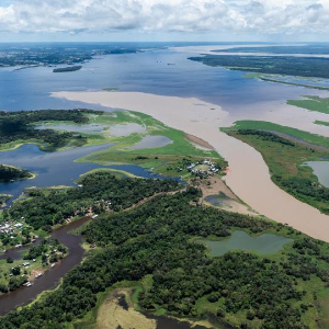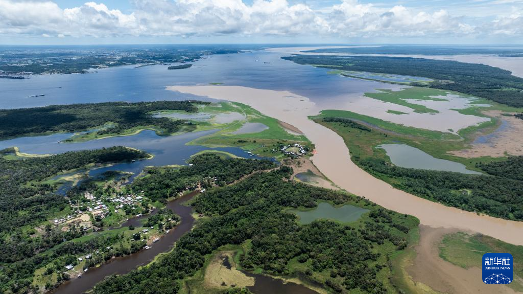 这是3月14日在巴西亚马孙州首府马瑙斯附近拍摄的亚马孙河(左)与内格罗河交汇处(无人机照片)。