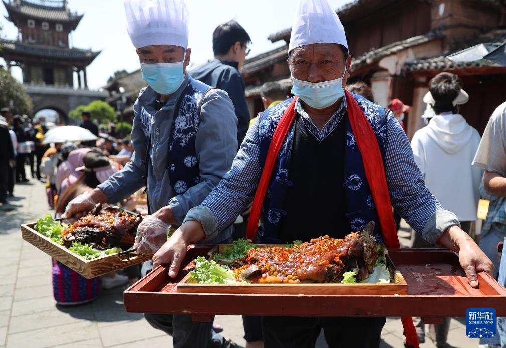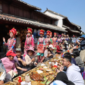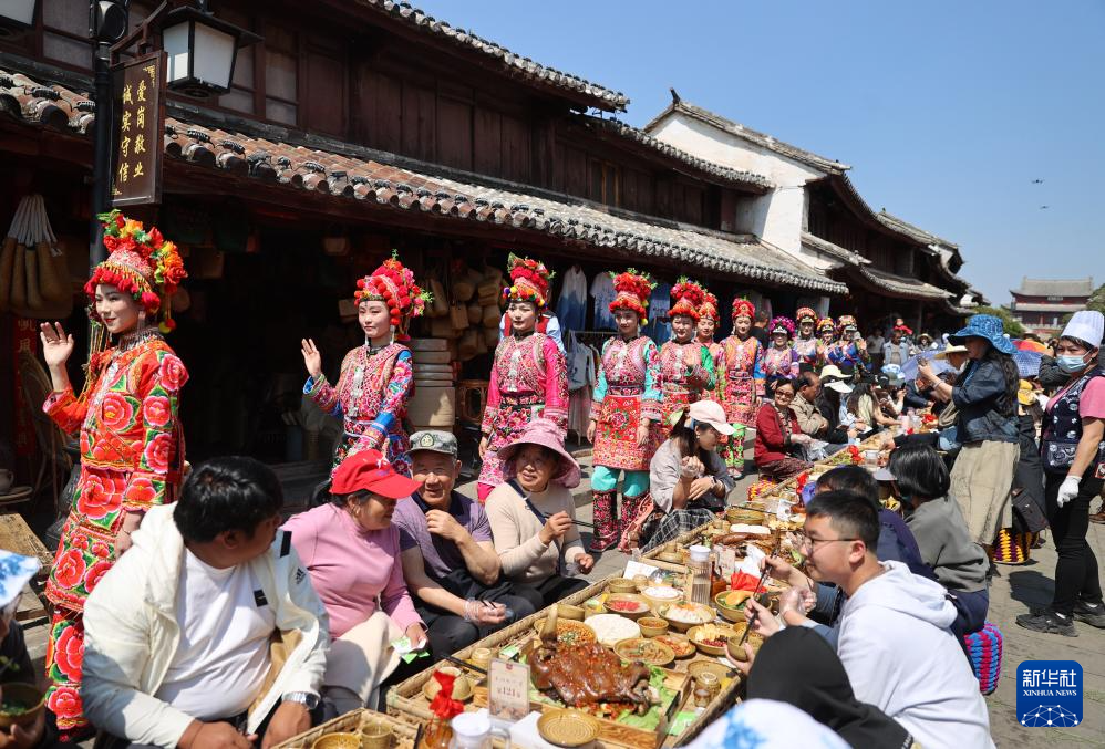 3月16日,在云南省巍山县巍山古城,身着民族服装的演员在巍山小吃节牛头长街宴上欢迎游客。