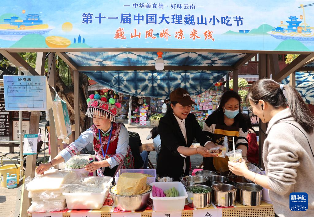 3月16日,在云南省巍山县巍山古城,游客在巍山小吃节上购买小吃。