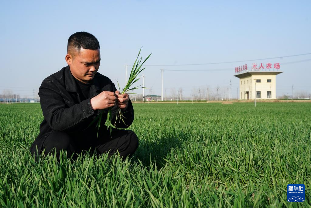3月19日,“90后”新农人焦瑞在无人农场中查看小麦长势。