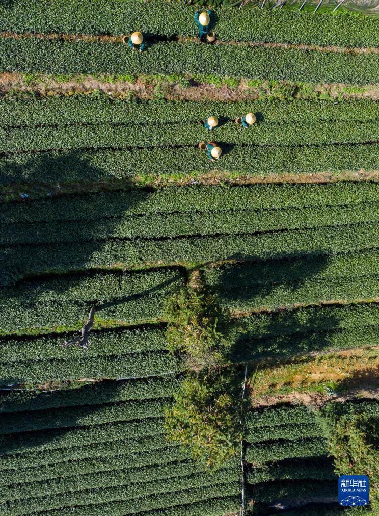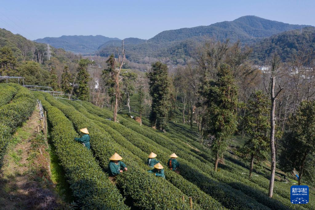 3月20日,梅家坞村的茶农在茶山上采摘西湖龙井“明前茶”(无人机照片)。