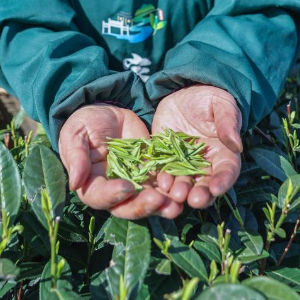 3月20日,梅家坞村的茶农展示刚刚采摘的西湖龙井鲜叶。