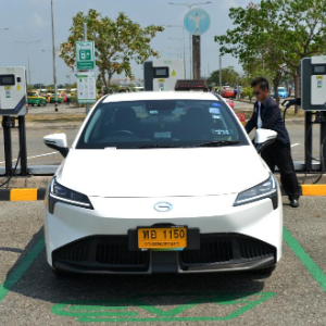 时尚的白色涂装、动感的车身线条、简洁的整车造型,在泰国曼谷素万那普机场,由中国车企生产的电动出租车成为一道靓丽的风景线。素万那普机场是泰国最大、最繁忙的国际机场,年吞吐量超过5000万人次,是不少游客进入泰国的第一站。为了进一步提升游客出行体验,泰国机场公司(AOT)和中国汽车品牌广汽埃安合作,自2024年1月起在素万那普机场引入电动出租车服务,助力打造成绿色出行机场。