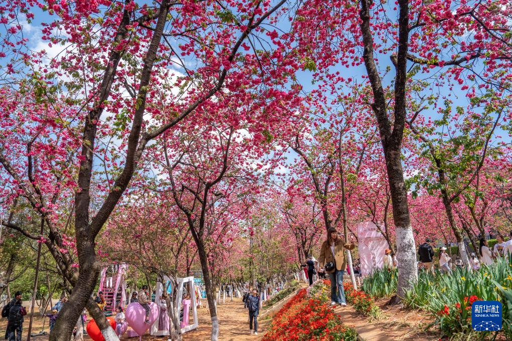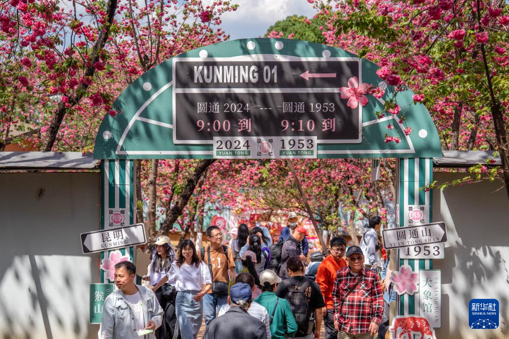 近日,云南昆明圆通山公园的樱花进入盛花期,吸引众多市民和游客前来观花赏景,乐享春日时光。