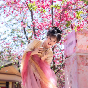 3月24日,一名游客在昆明圆通山公园的樱花树下留影。