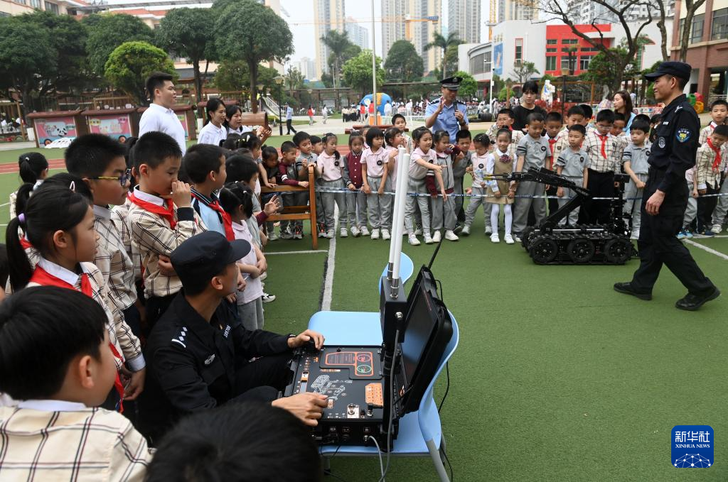 3月25日,在广西壮族自治区直属机关第三幼儿园,公安民警在为师生进行排爆机器人展示。