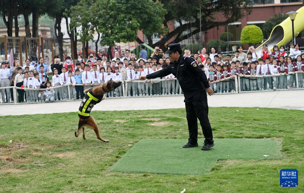 3月25日,在广西壮族自治区直属机关第三幼儿园,公安民警在为师生进行警犬表演。