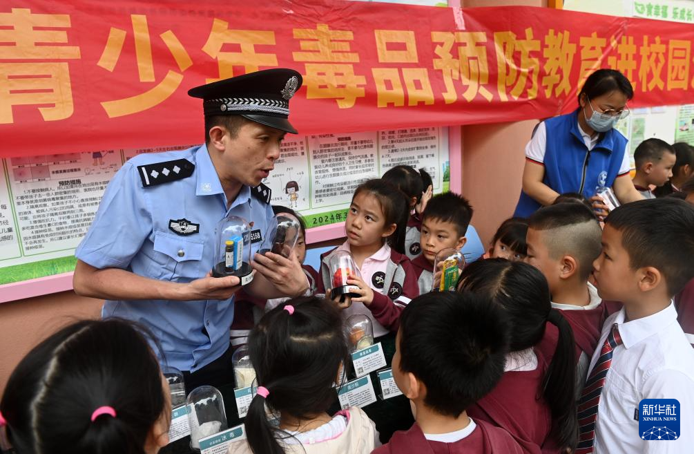 3月25日,在广西壮族自治区直属机关第三幼儿园,公安民警在为学生进行禁毒宣传。