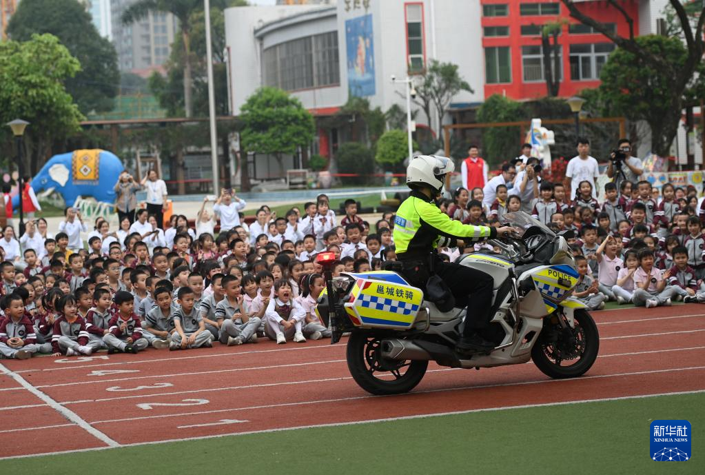 3月25日,在广西壮族自治区直属机关第三幼儿园,公安民警在为师生进行铁骑表演。
