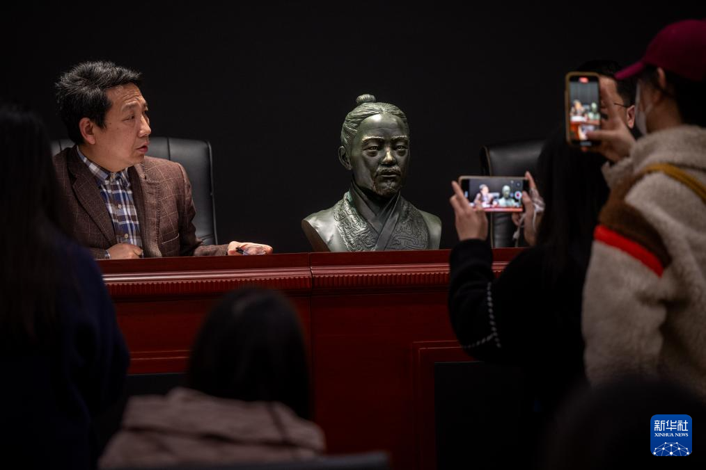 3月25日,湖北省博物馆副馆长王先福在介绍云梦睡虎地秦简主人“喜”的复原像。