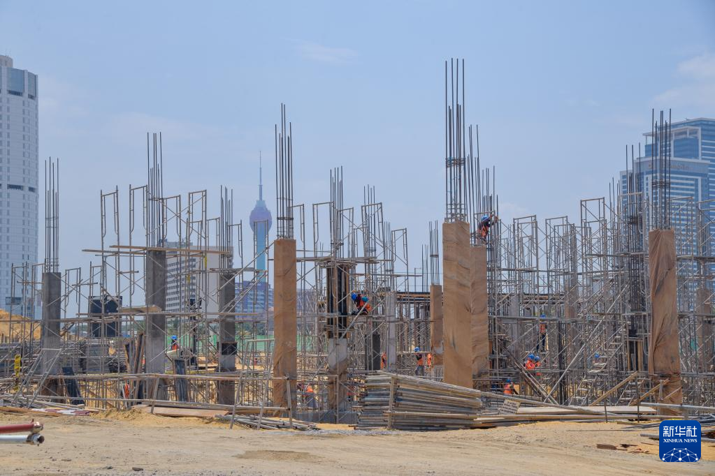3月27日,工人在斯里兰卡科伦坡港口城的施工现场进行作业。