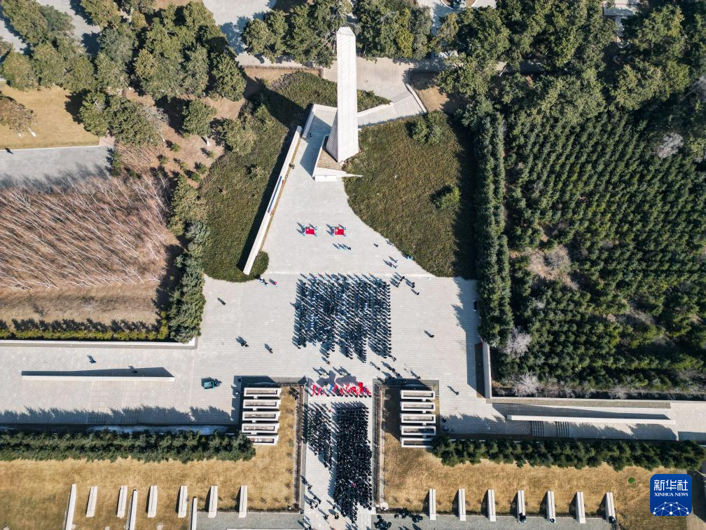 4月2日,在位于河北省石家庄市的华北军区烈士陵园,学生们为革命英烈献花。