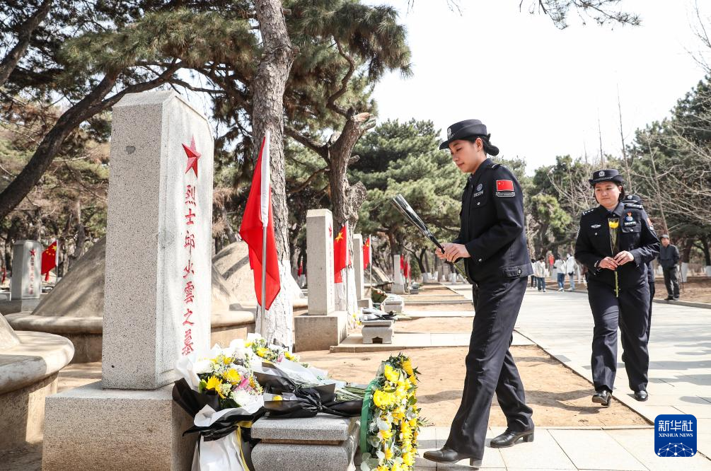 4月2日,在沈阳抗美援朝烈士陵园,沈阳出入境边防检查站民警在烈士墓碑前献花。