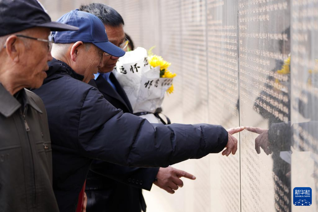 4月3日,在沈阳抗美援朝烈士陵园,史荣升(左二)等人在瞻仰烈士英名墙。