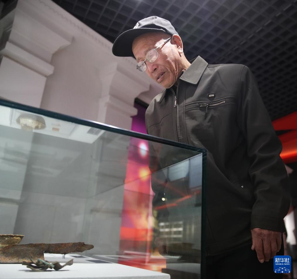 4月3日,在史万忠烈士遗物展柜前,史荣升(右一)等人瞻仰遗物。