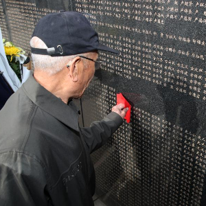 4月3日,在沈阳抗美援朝烈士陵园,史荣升老人用红布轻轻擦拭烈士英名墙上父亲的名字。