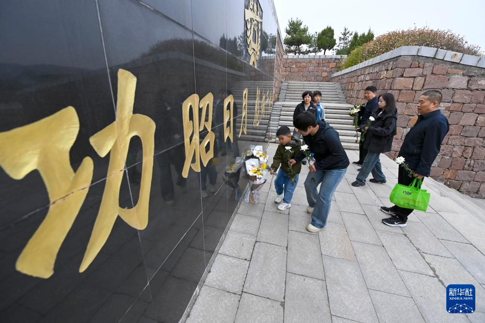 4月3日,在位于武乡县里庄村的八路军烈士陵园,梁效珍的重外孙杨崇颢(左一)为烈士献花。