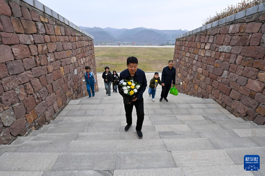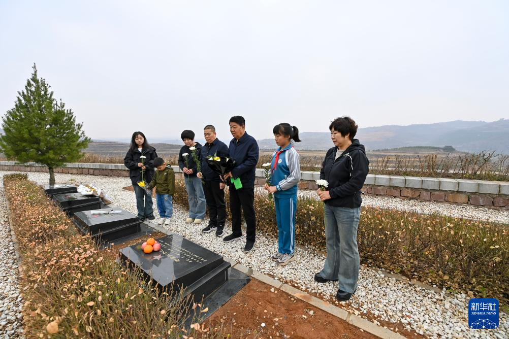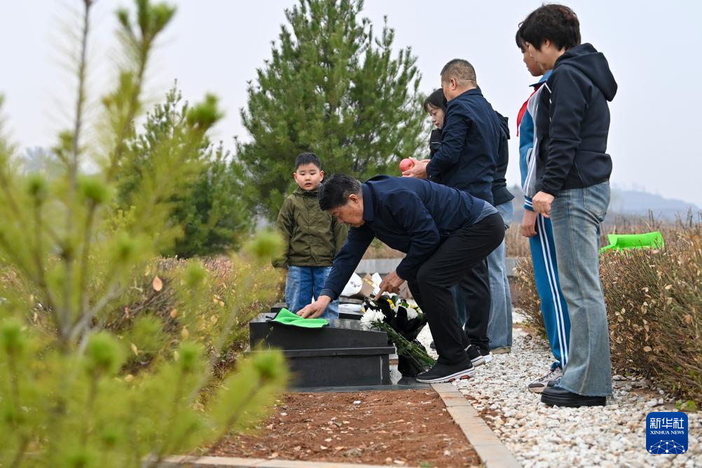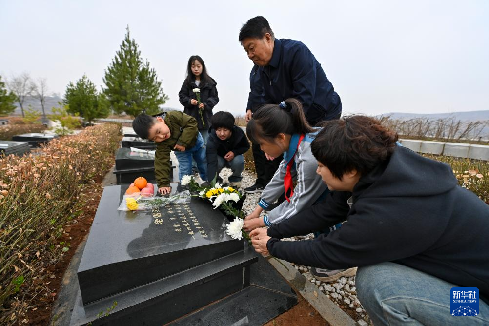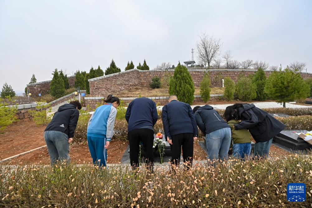 4月3日,在位于武乡县里庄村的八路军烈士陵园,梁效珍一家为烈士献花。