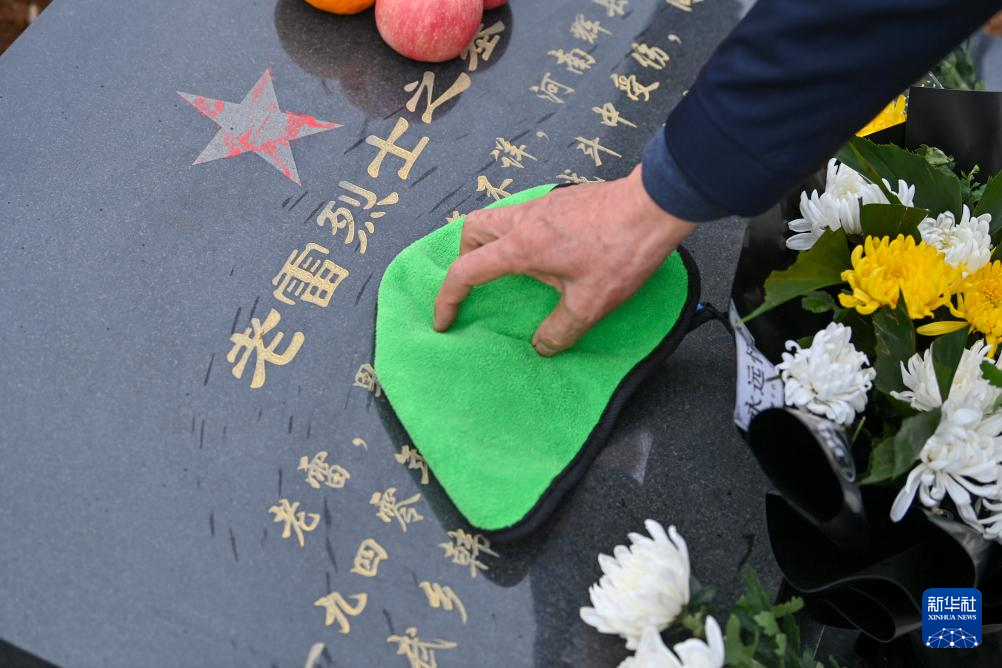 4月3日,在位于武乡县里庄村的八路军烈士陵园,梁效珍擦拭雷姓烈士墓碑上的尘土。
