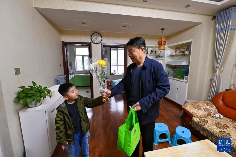 4月3日,在位于武乡县丰州镇的家里,梁效珍(右)在出发前把为烈士准备的鲜花递给重外孙杨崇颢。