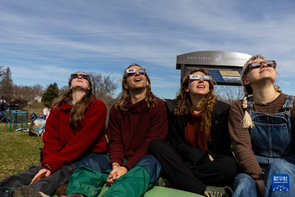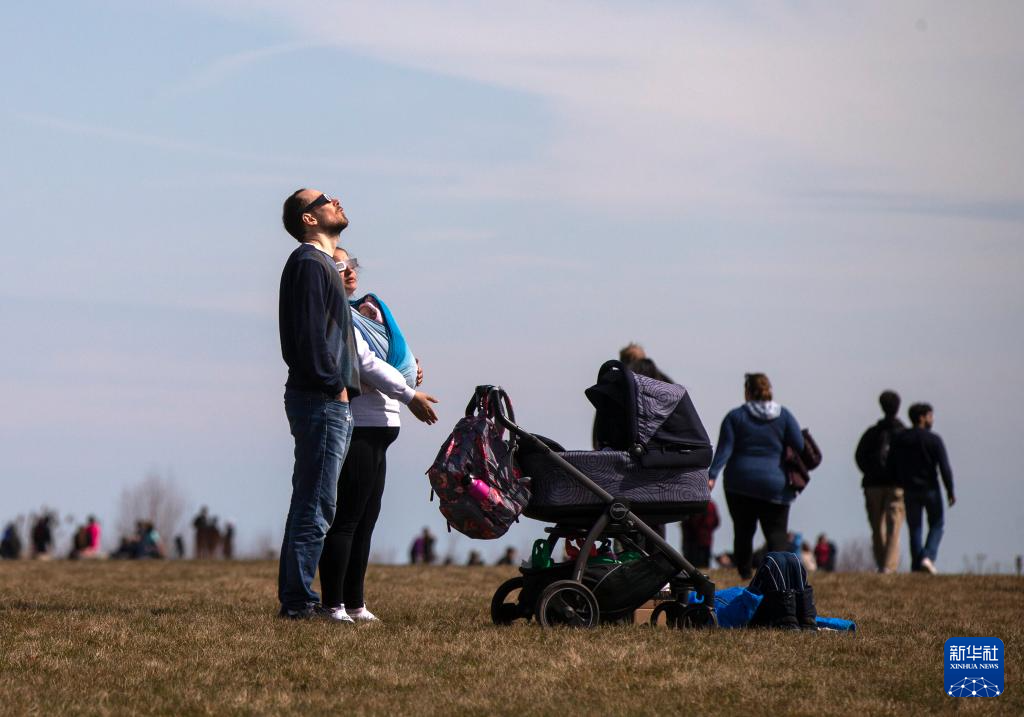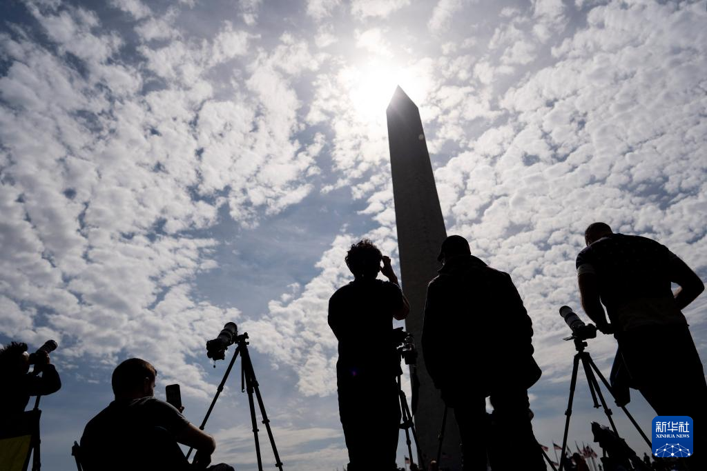 4月8日,人们在美国首都华盛顿的国家广场草坪上观看日食。