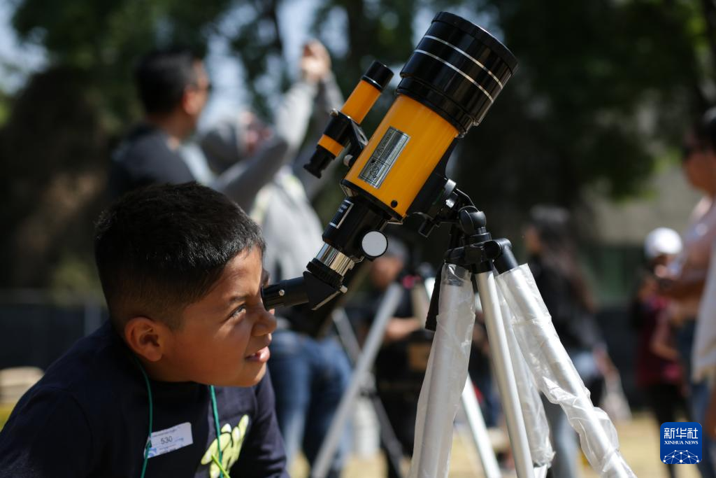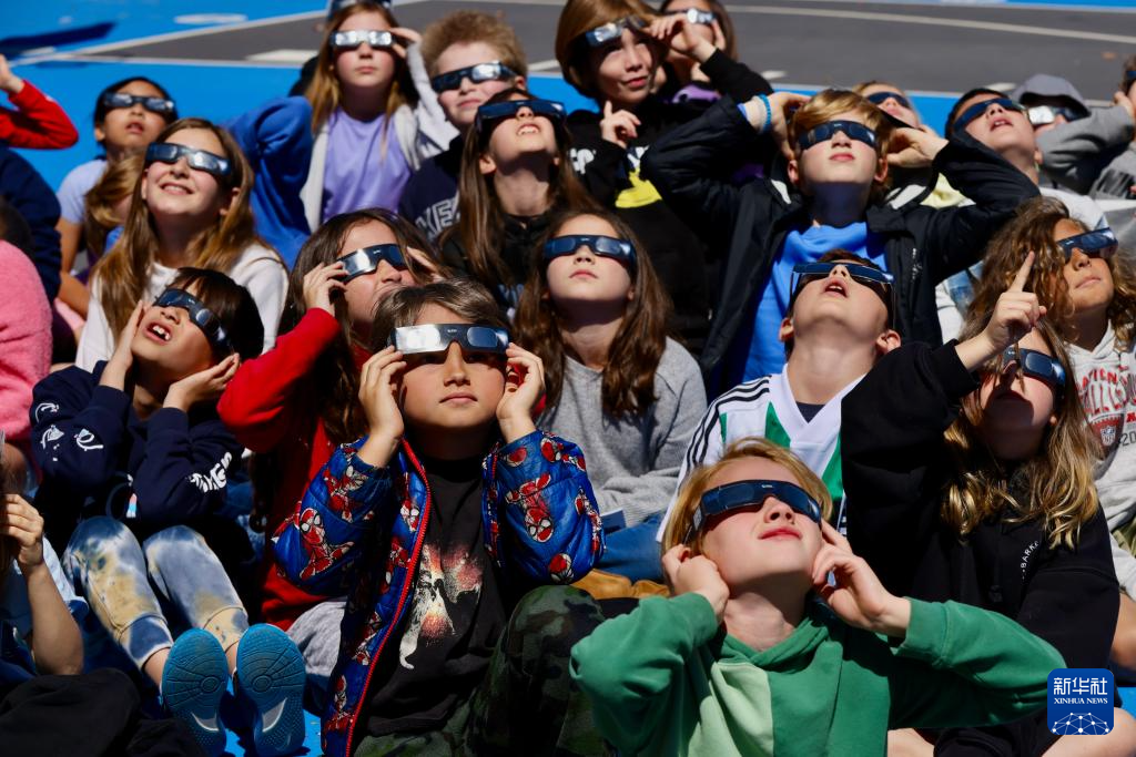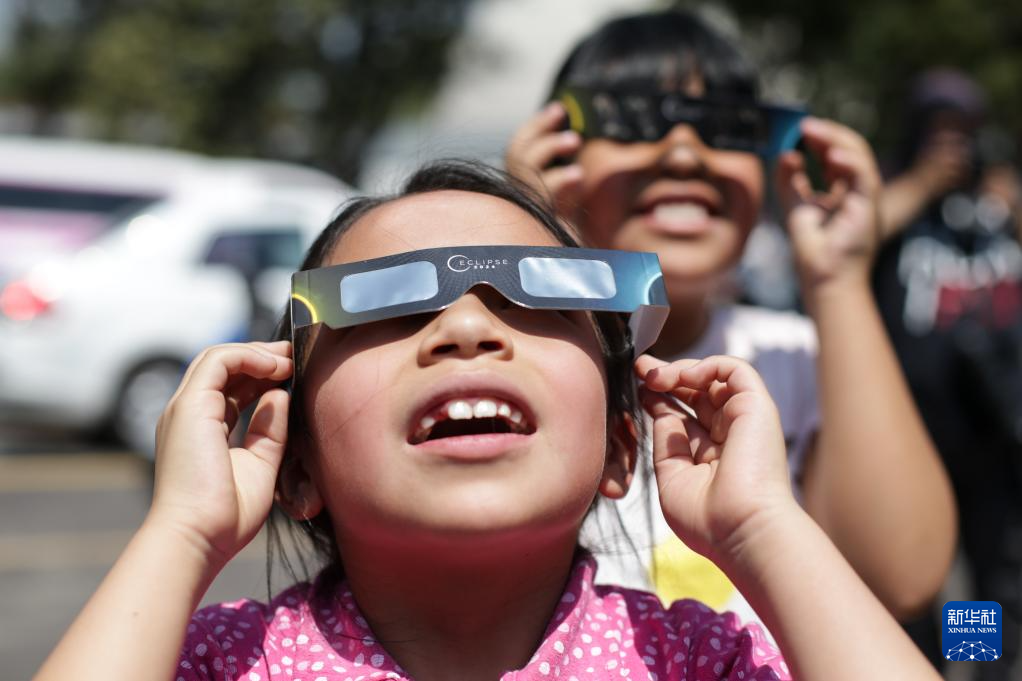 4月8日,美国洛杉矶一所小学的学生在校园内观看日食。
