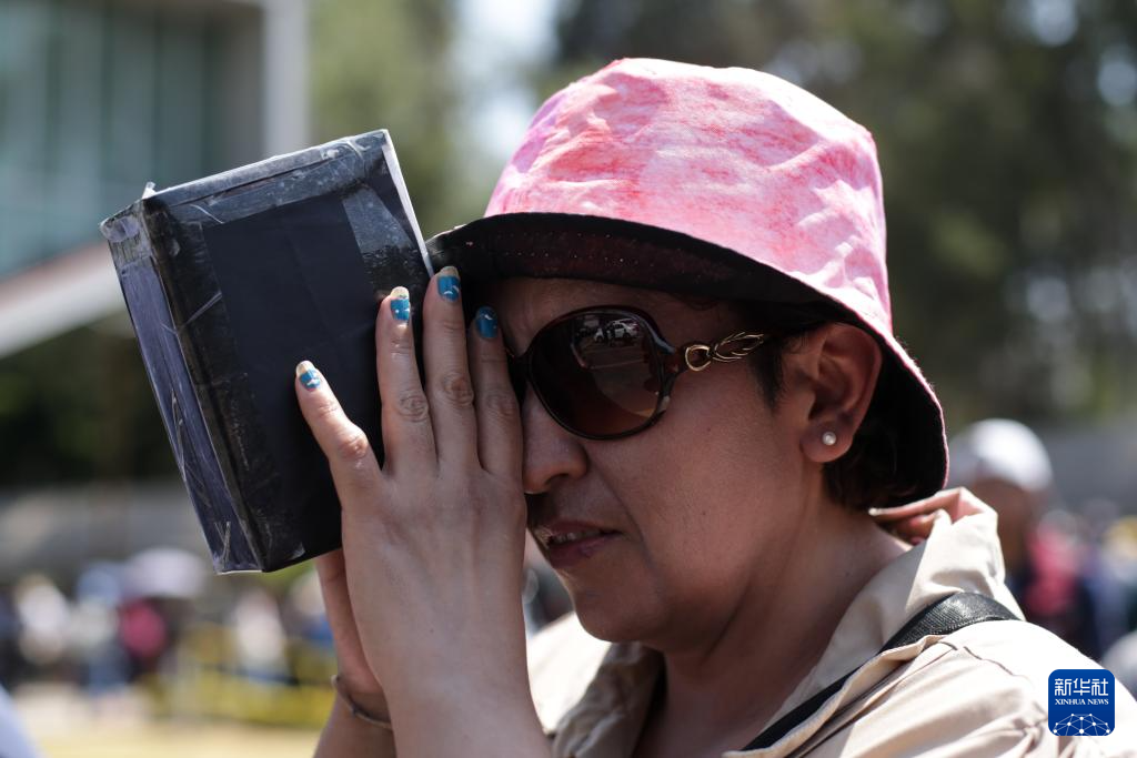 4月8日,一名女子在墨西哥首都墨西哥城的一家天文馆外观看日食。
