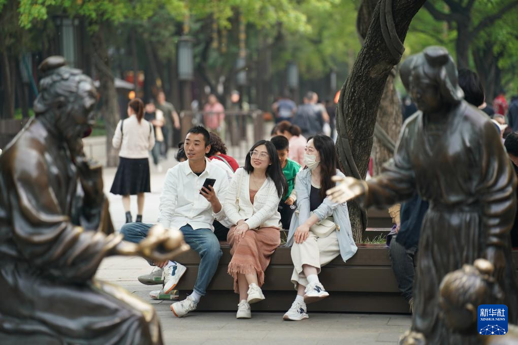 4月8日,人们在西安大雁塔广场拍照、游玩。