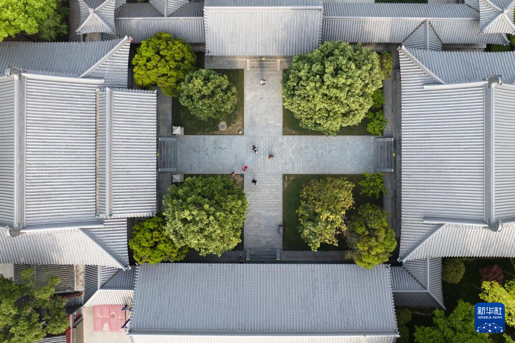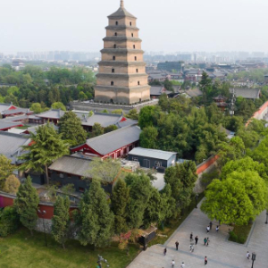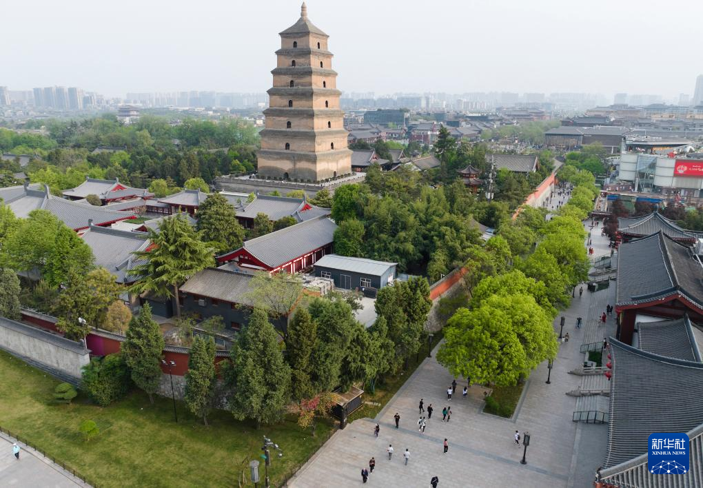 4月8日,人们在西安大慈恩寺内游览(无人机照片)。