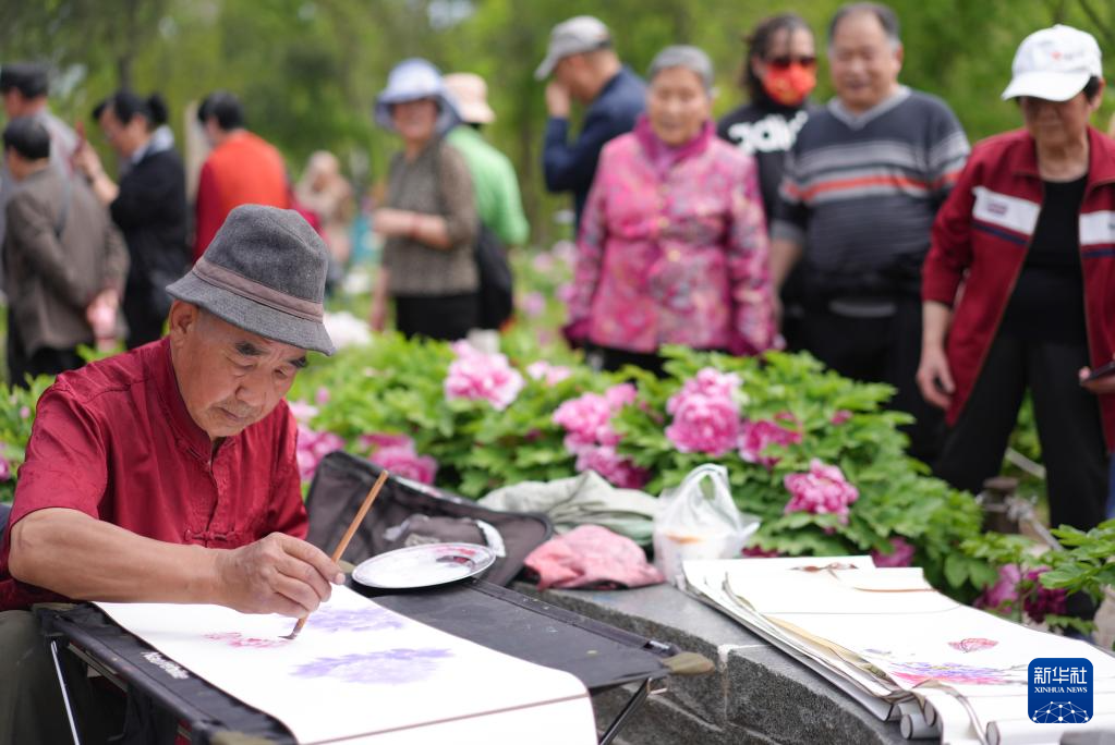 4月9日,市民(左)在西安市兴庆宫公园作画。