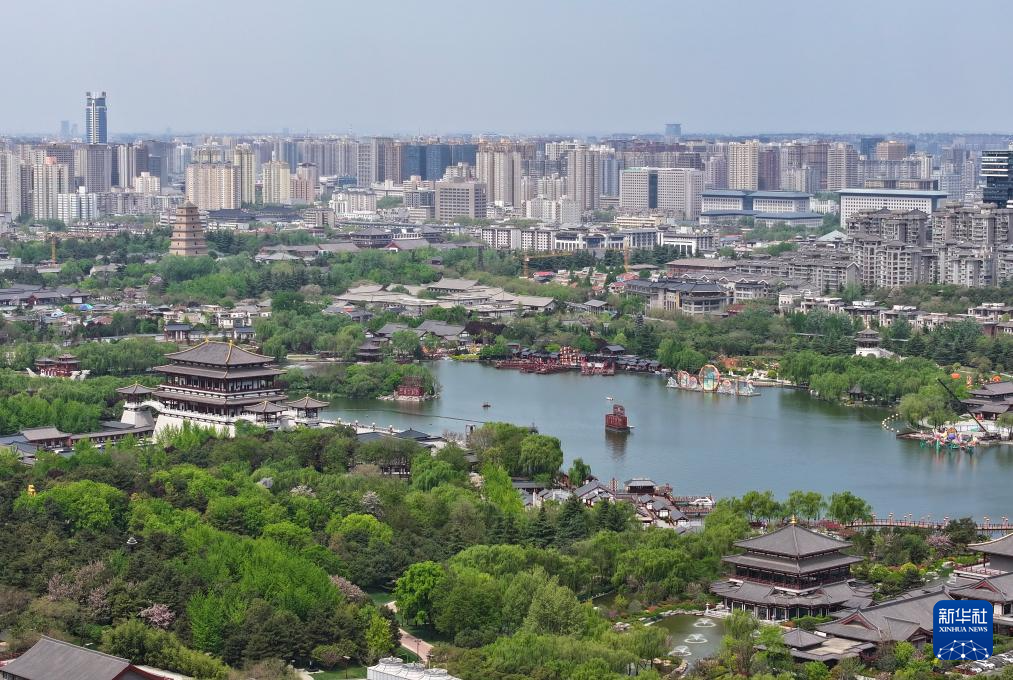 这是4月9日拍摄的西安市大唐芙蓉园(无人机照片)。