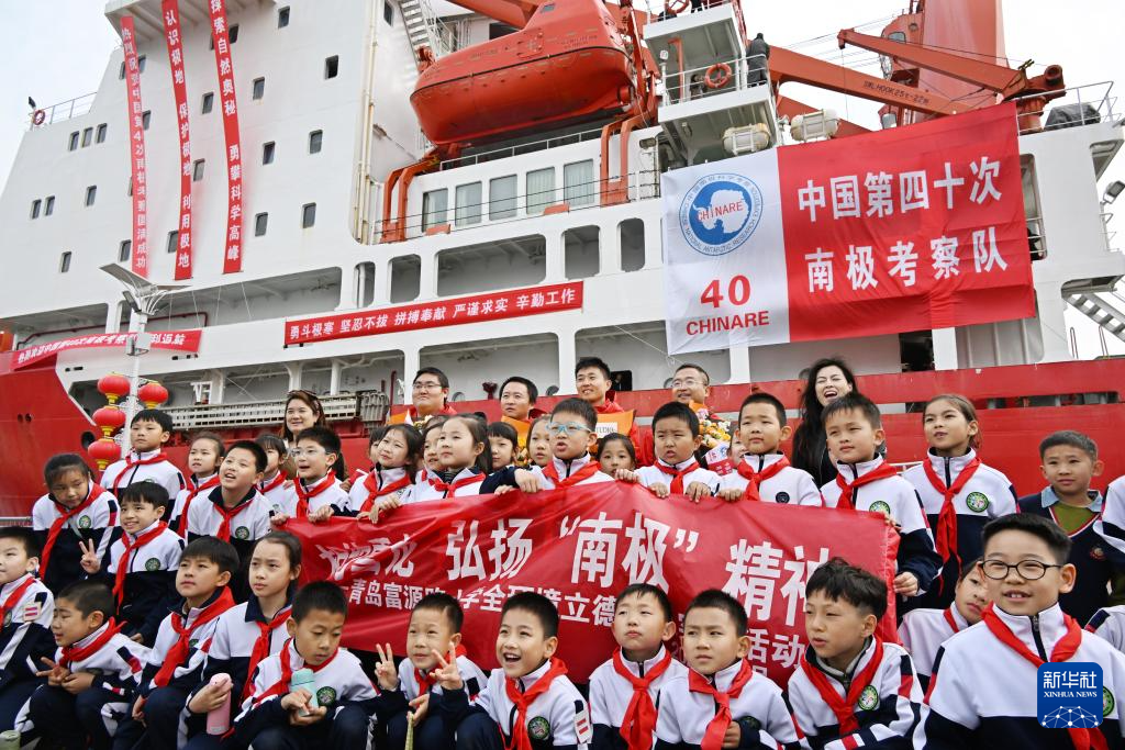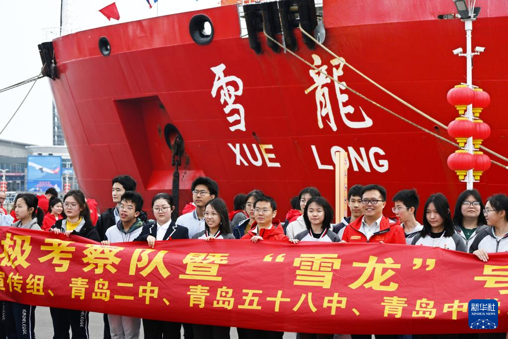 4月10日,青岛奥帆基地码头,学生与科考队员在“雪龙”号前合影留念。