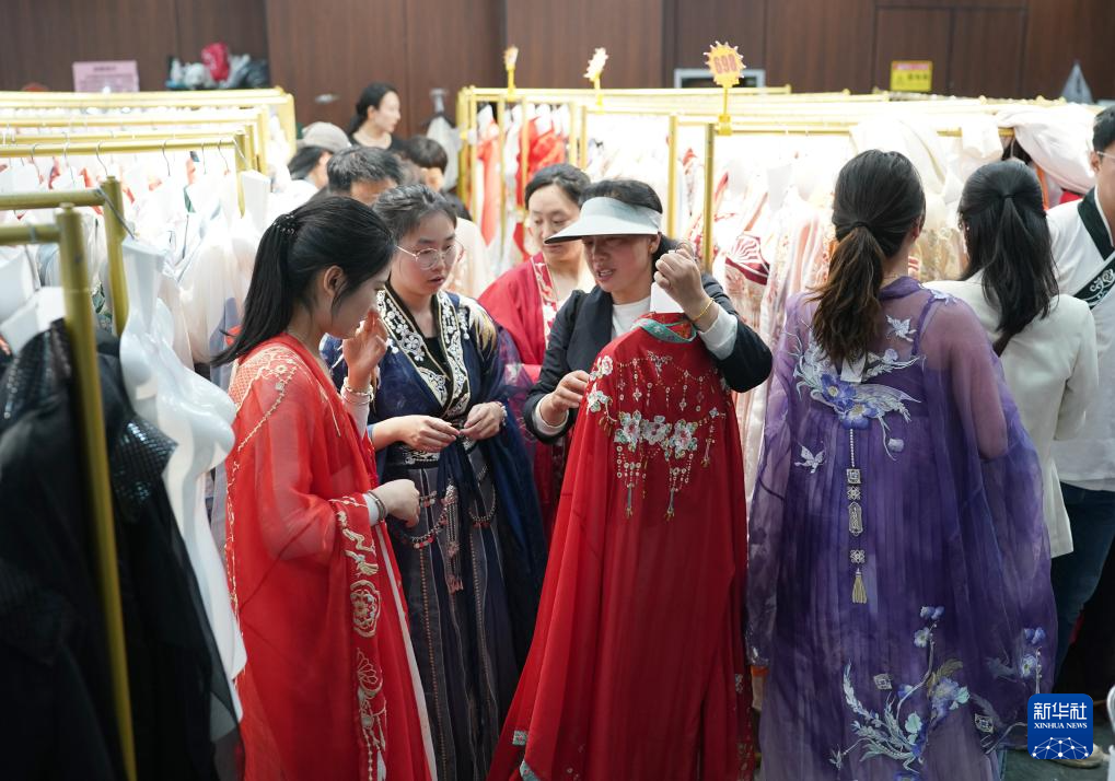 4月10日,年轻人在西安曲江新区一家传统服饰馆内挑选服装。
