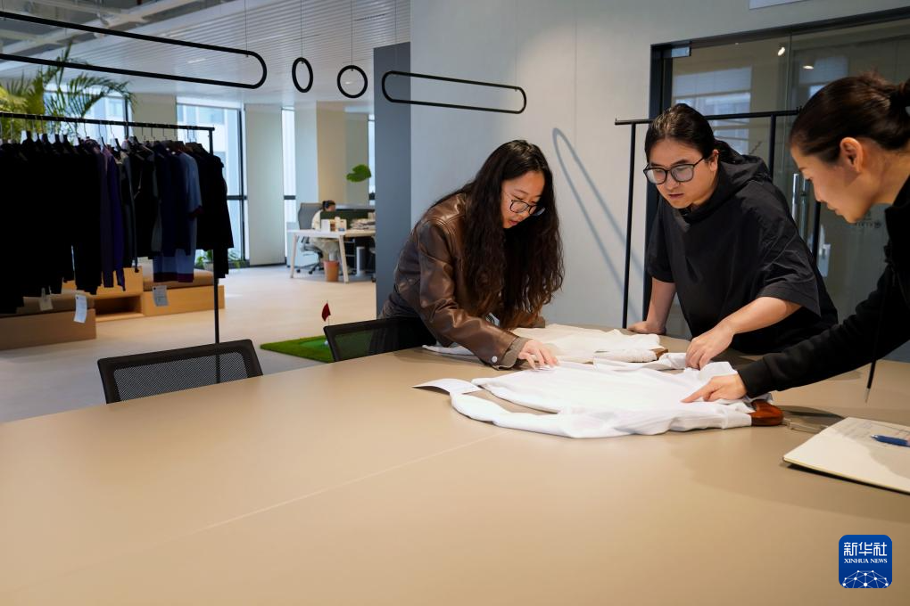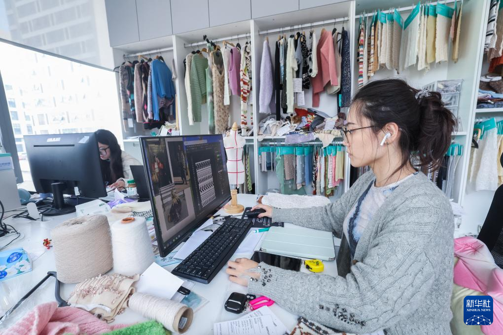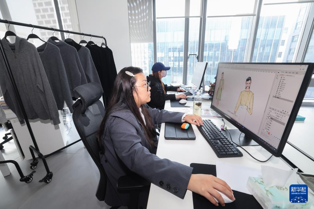 4月9日,在濮院临空产业园内的浙江汇港时装有限公司的设计部,设计师在设计新款时装。